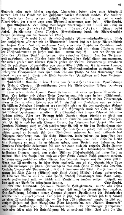 | Sek.-Lit.; Rez. | Niederdt. Warte 7, 1939, Nr. 12, S. 19 (Rud. Hermann) | Aufführung | UA: Niederdeutsche Bühne Hamburg, 25.11.1939 |